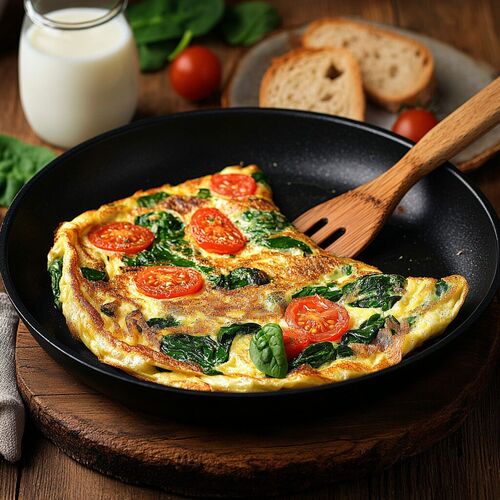 Омлет со шпинатом и помидорами + ломтик цельнозернового хлеба