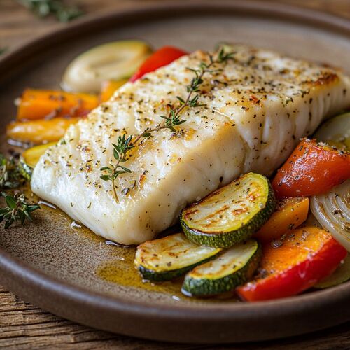 Сервировка: Подавайте запечённую треску вместе с овощами на одной тарелке. При желании можно приготовить к этому блюду лёгкий соус из натурального йогурта с зеленью.