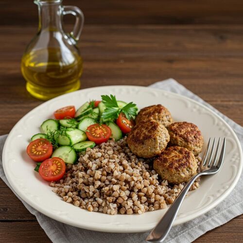 Сервировка: Выложите тёплые тефтели на тарелку с порцией гречки и подайте вместе со свежим салатом.