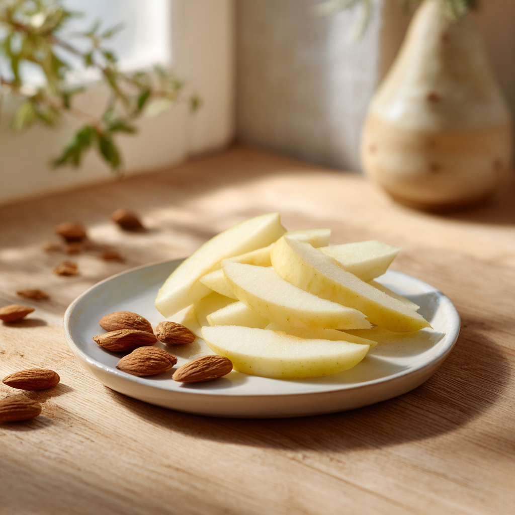 КБЖУ примерно 110 ккал. (Яблоко 150 г, миндаль 10 г)