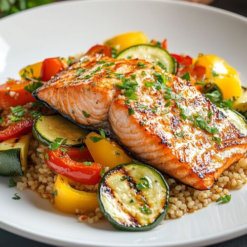 5. Ужин: лосось с булгуром и овощами (около 425 ккал)