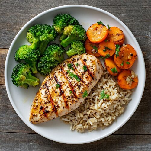 3. Обед: куриная грудка с коричневым рисом и овощами (около 435 ккал)